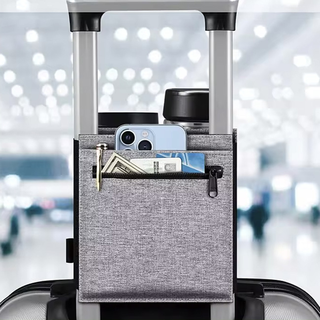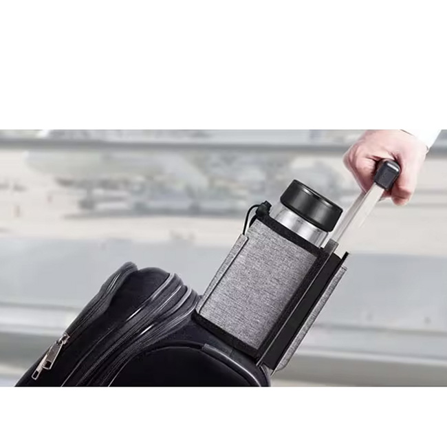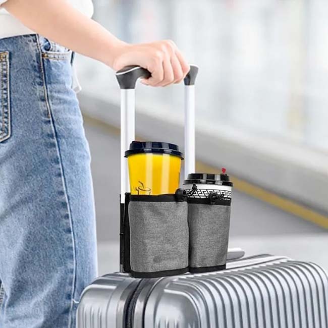 Práctico porta latas adaptable al sistema trolley de equipajes. Capacidad para 2 latas y/o botellas. Cierre en elástico con dona ajustable. Doble compartimento posterior para tarjetas y/o documentos.