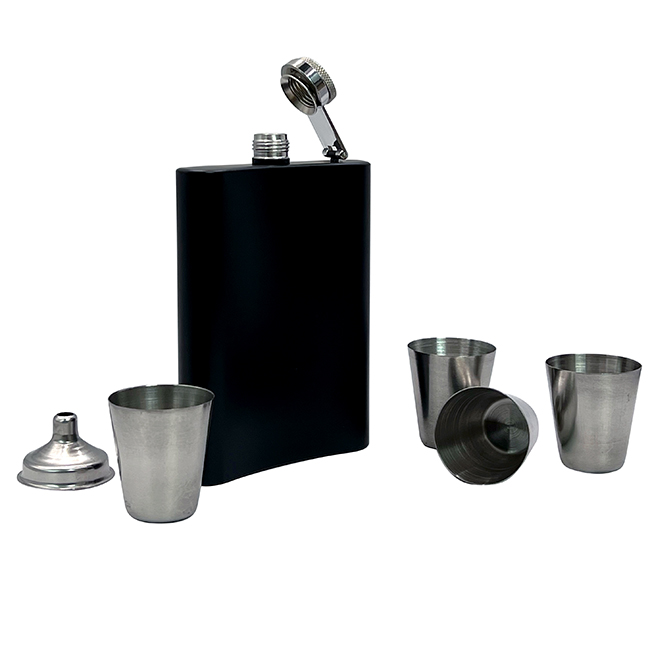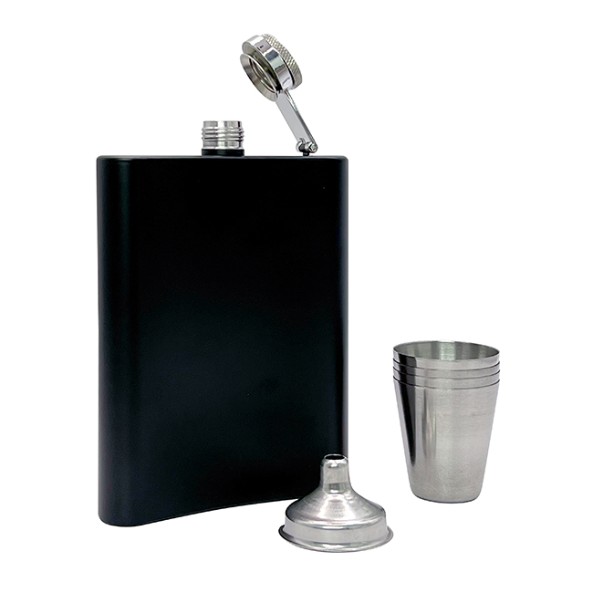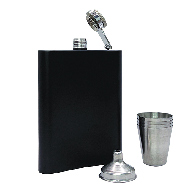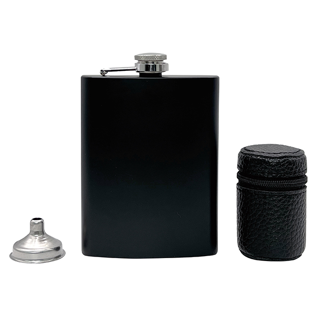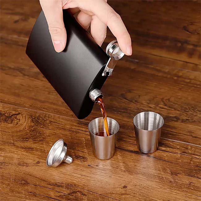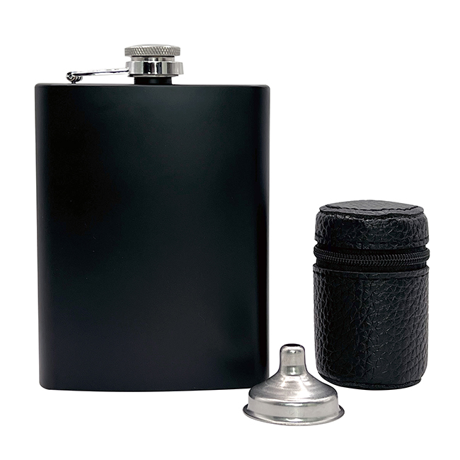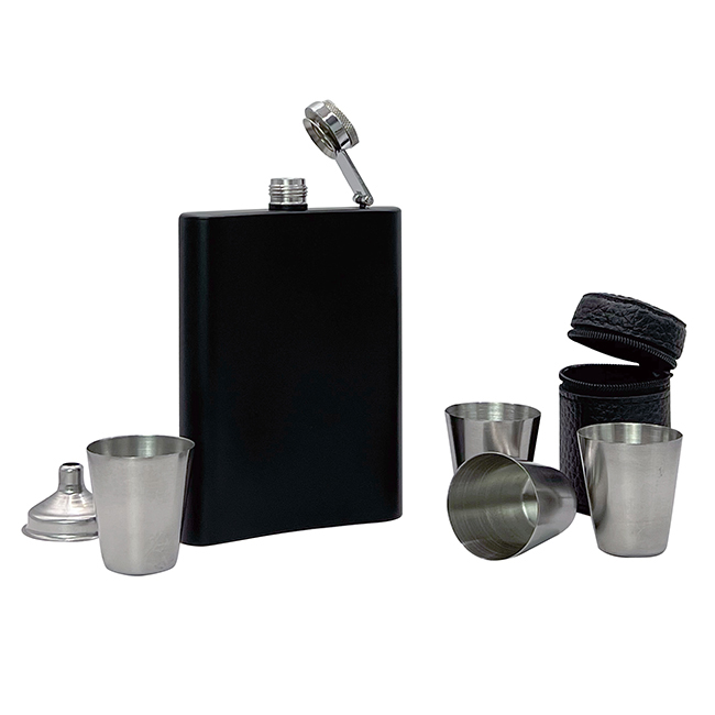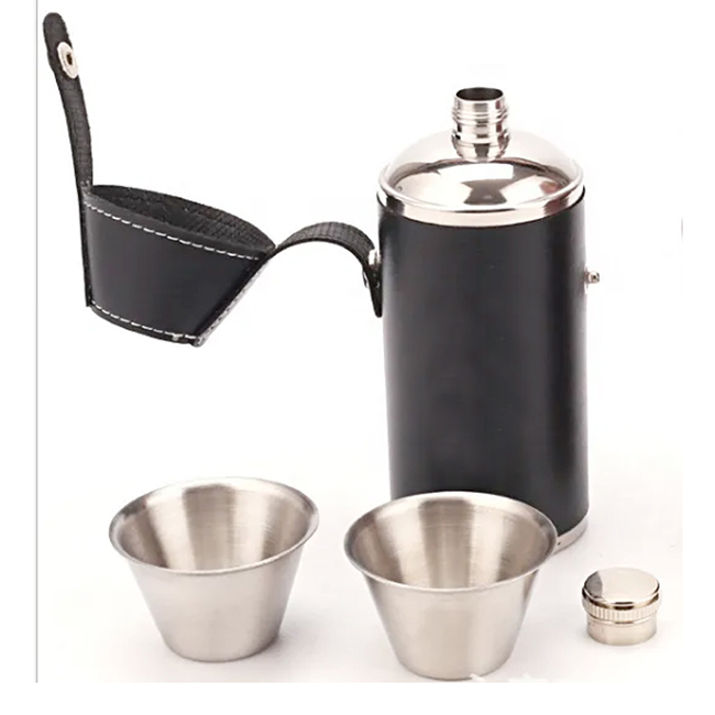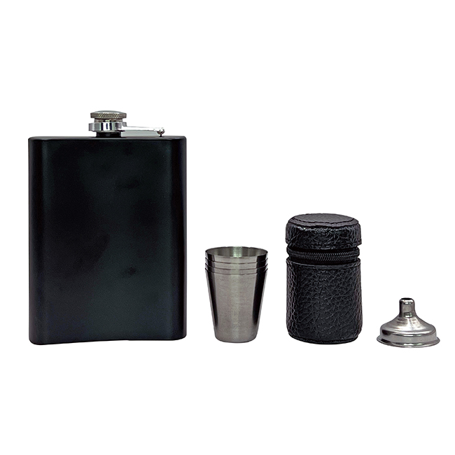 Capacidad: 220 ml. Tapa en rosca. Incluye embudo y 4 vasos-shot en estuche de curpiel.