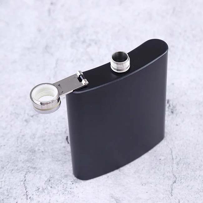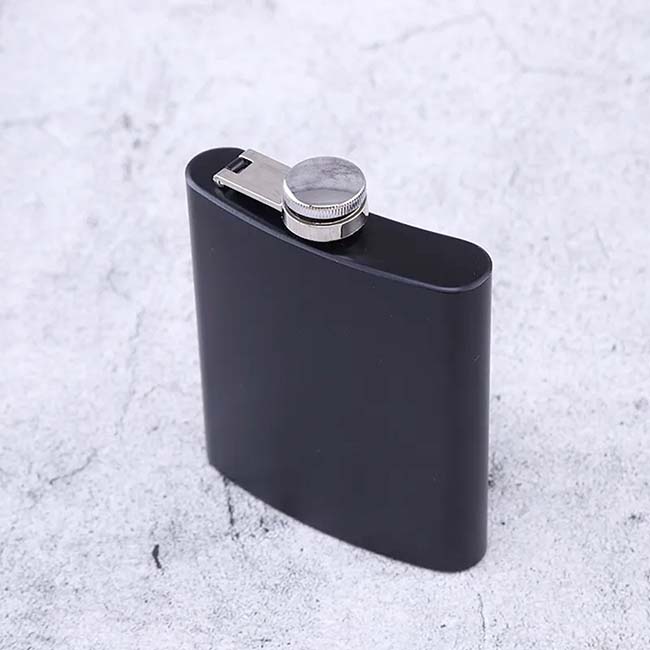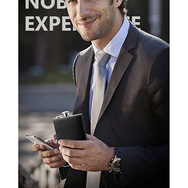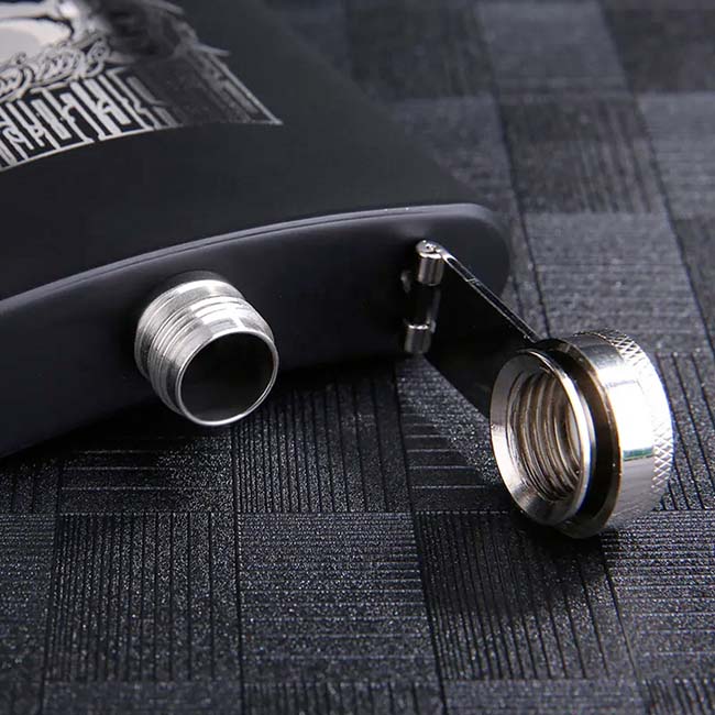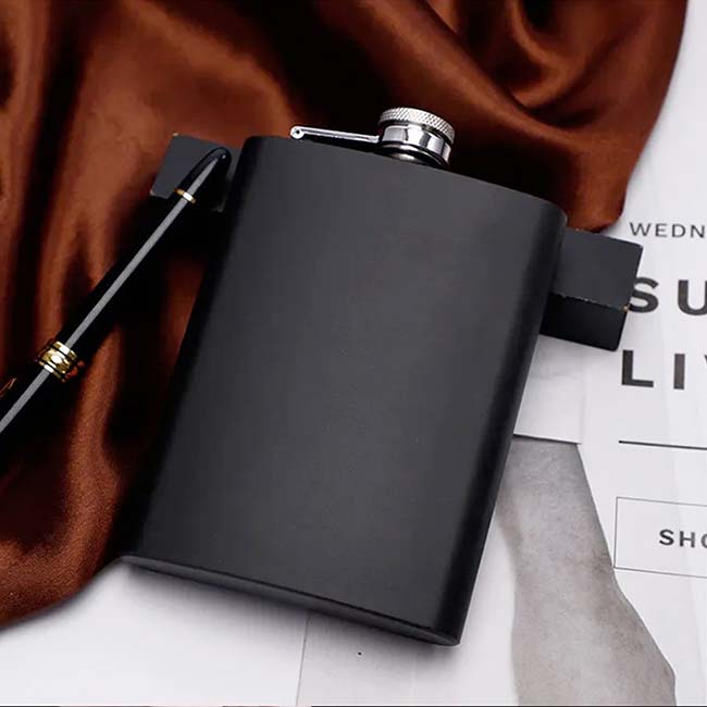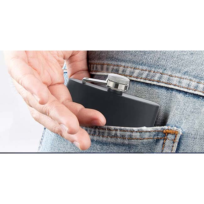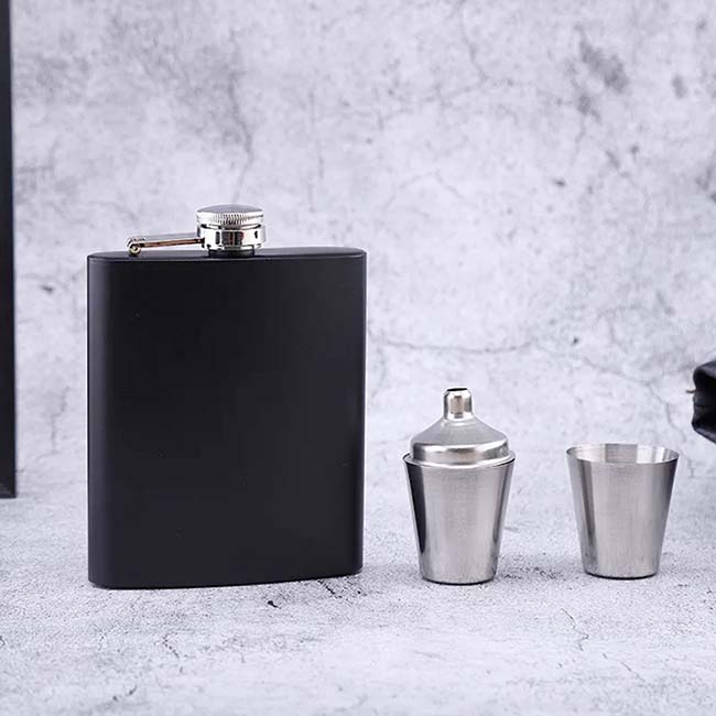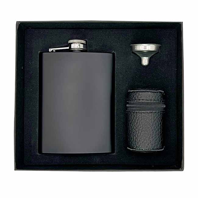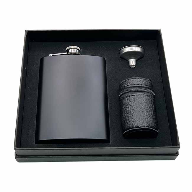 Capacidad: 220 ml. Tapa en rosca. Incluye embudo y 4 vasos-shot en estuche de curpiel.
