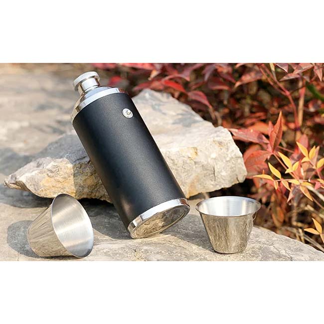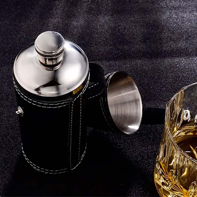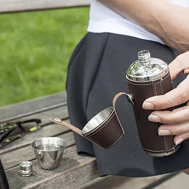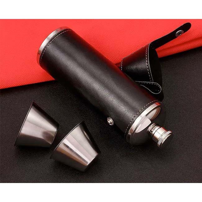 Capacidad: 290 ml. Práctico tamaño. Diseño apto para viajar. Tapa en rosca. Funda en curpiel. Embudo y 2 vasos-shot.