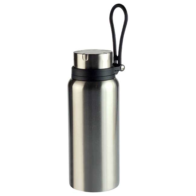 Capacidad: 950 ml. Sistema de doble pared al vacío. Resistente correa sujetadora con pivote rotatorio. Color: Plata