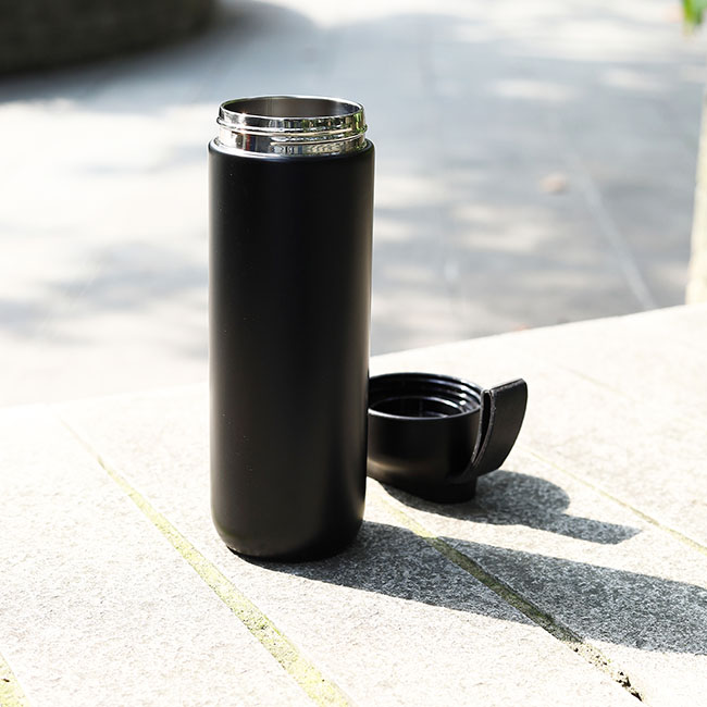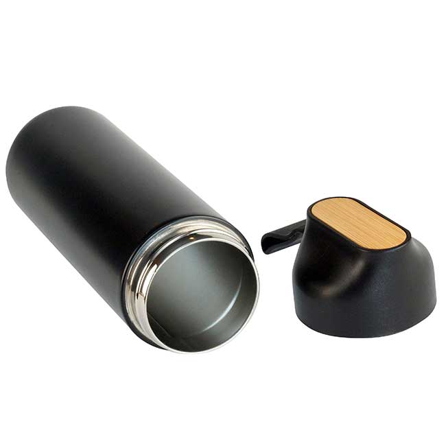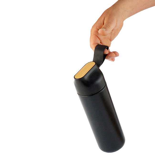 Capacidad: 600 ml. Sistema de doble pared al vacío. Correa de silicón para sujetar. Detalle de lámina de bamboo en tapa. Color: Negro