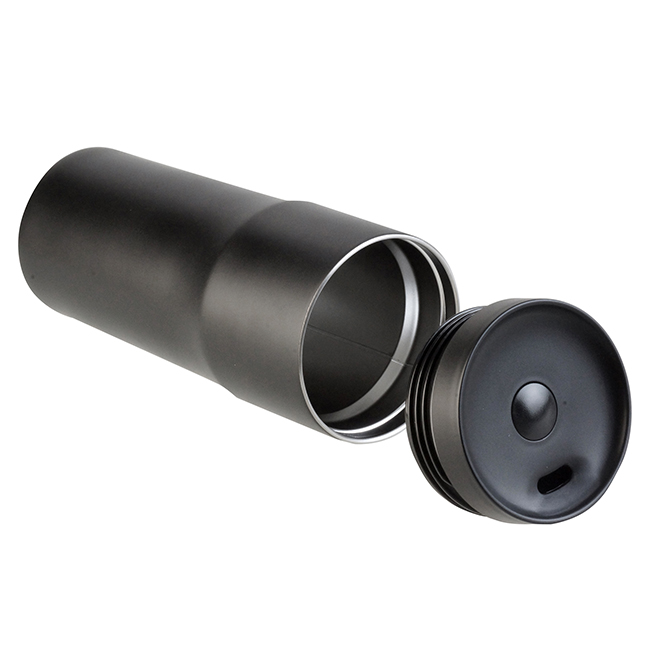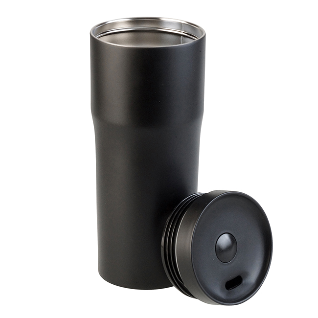 Termo Yuca Capacidad: 480 ml. Funciones: Sistema de doble pared al vacío. Insertable al auto. Tapa con botón de cierre automático. Color Negro.