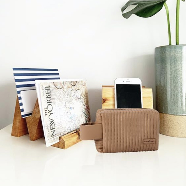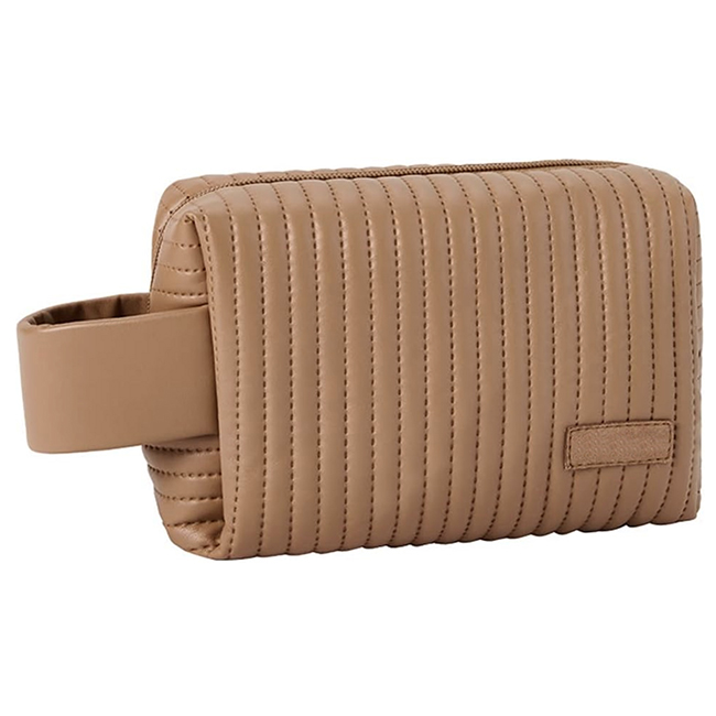 Cosmetiquera Cumbal Cierre en zipper con correa en lomo para sujetar. Etiqueta al frente para personalizar. Colores: Beige, Café, Celeste, Rosa y Verde