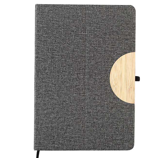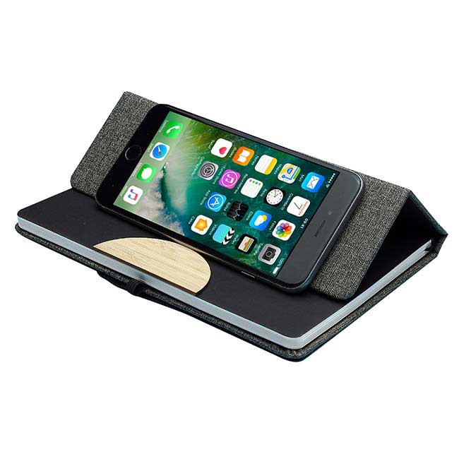 Detalle de bamboo en pestaña de cierre. Sistema para stand móvil y porta bolígrafo. Cinta divisoria. Aprox. 80 hojas rayadas. Color: Gris.