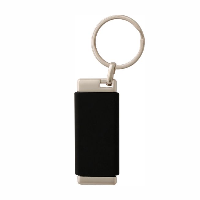 Novedoso llavero con combinación de materiales. Metal satinado con cubierta de silicón hipoalergénico que permite grabado en bajo relieve. Incluye estuche individual.