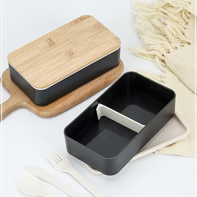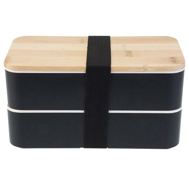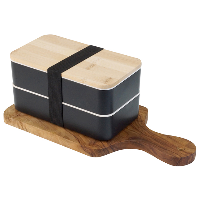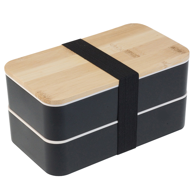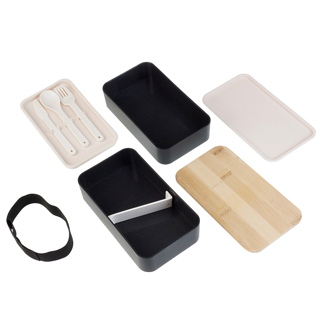 Doble Lucnh-Box Polaris Dos recipientes con cinta elástica para sujetar. Tapa de bamboo. Puede introducirse en microondas. Barra divisoria movible. Tapa intermedia con juego de cubiertos: cuchara, tenedor, cuchillo.