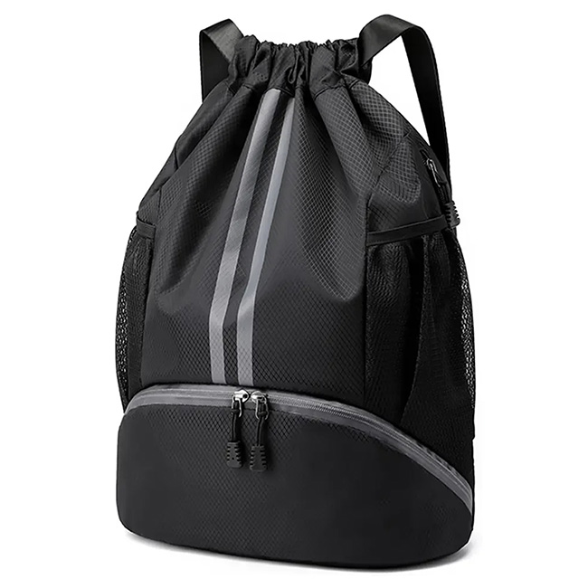 Backpack Durant l Compartimento principal con cierre en correa ajustable. l Bolsillos laterales en tela mesh. l Compartimento inferior independiente con cierre en zipper. l Impermeable al agua. l Colores: Negro
