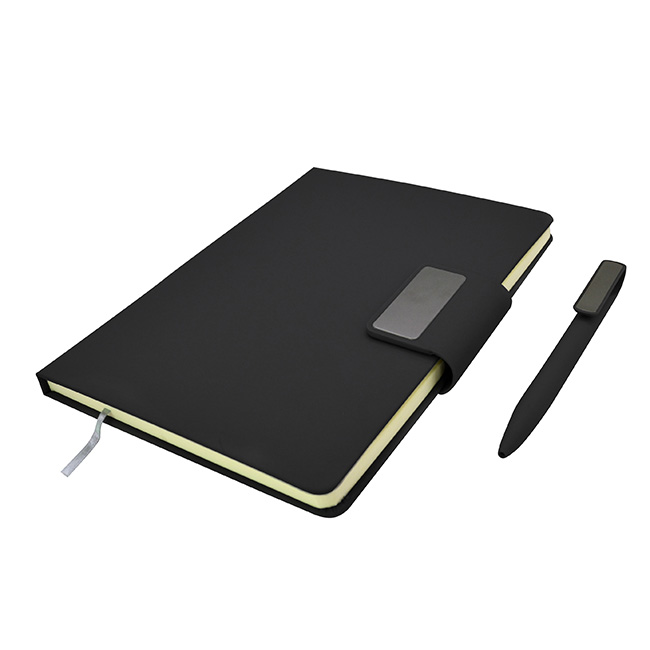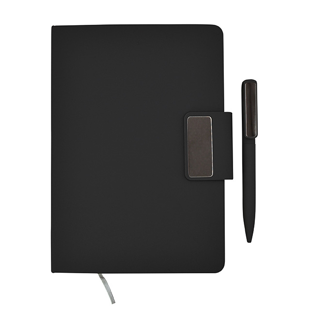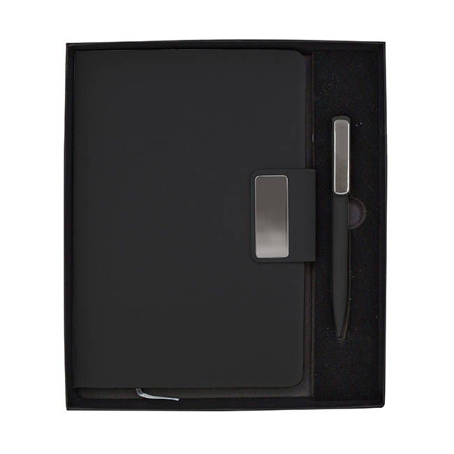 Set Barcelona l Incluye libreta, bolígrafo y estuche de presentación. l Libreta con 80 hojas rayadas. l Cinta divisoria. l Cierre con ceja magnético y placa para personalizar. l Bolígrafo de metal con mecanismo rotativo. l Colores: Negro.