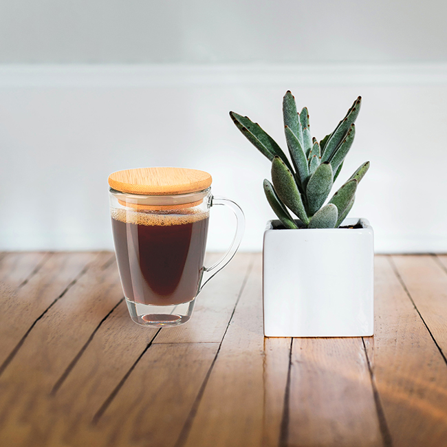 Taza Beluga Capacidad: 235 ml l Tapa de bamboo con banda de silicón para cierre a presión. l Colores:Transparente.